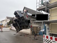 Bei Dacharbeiten stürzte ein mobiler Kran auf das Nachbargebäude und beschädigte das Dach. Glücklicherweise wurde dabei niemand verletzt.